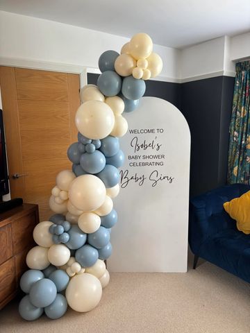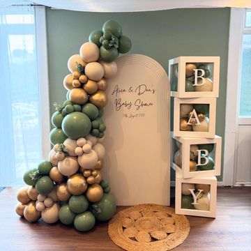This package includes a full round balloon arch and balloon filled wooden baby blocks to suit your colour scheme.