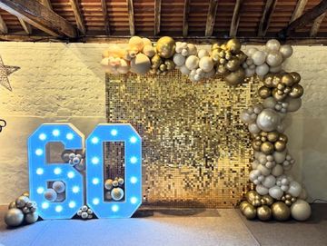 This includes a backdrop of your choice, two light up numbers & balloon garland one side with colours of your choice up to three.