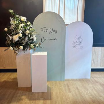 Includes a white sailboard backdrop with wording of your choice & styled balloon garland in colours of your choice.