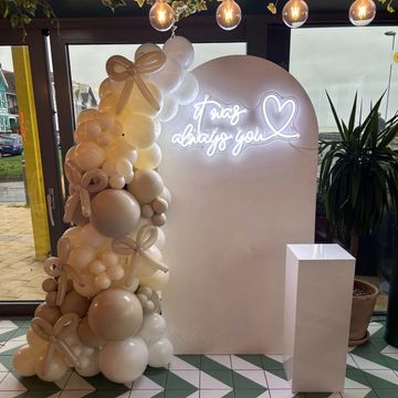 This includes our white sailboard backdrop and balloons styled like the image in colours of your choice. Recommend 2/3 colours. Neon (It was always you & cake plinth.