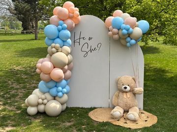 This includes our 4ft led question mark with either clear bulbs or blue & pink. 8ft styled balloon garland in two colours of your choice attached to wall.