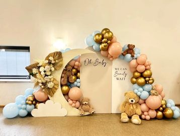 This package includes two white sailboard backdrop with wording of your choice. Balloons styled like the image in colours of your choice. Bear & hot air balloons ..